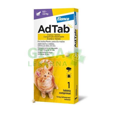 Pro zajištění maximální účinnosti podávejte kočce jednu žvýkací tabletu měsíčně, a to současně s krmivem nebo do 30 minut po krmení. U koček těžších než 8 kg živé hmotnosti použijte vhodnou kombinaci tablet tak, abyste dosáhli doporučené dávky 6–24 mg/kg živé hmotnosti. UpozorněníNepoužívat v případech přecitlivělosti na léčivou látku nebo na některou z pomocných látek. Balení AdTab 12mg žvýkací tablety pro kočkyBalení obsahuje 1 tabletu pro kočky. InfografikaTV reklama AdTab pro kočkyPříbalová informaceZobrazit příbalovou informaci. 1. Název veterinárního léčivého přípravkuAdTab 12 mg žvýkací tablety pro kočky (0,5–2,0 kg) AdTab 48 mg žvýkací tablety pro kočky (>2,0–8,0 kg) 2. SloženíKaždá žvýkací tableta obsahuje: