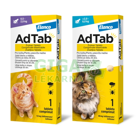Pro zajištění maximální účinnosti podávejte kočce jednu žvýkací tabletu měsíčně, a to současně s krmivem nebo do 30 minut po krmení. U koček těžších než 8 kg živé hmotnosti použijte vhodnou kombinaci tablet tak, abyste dosáhli doporučené dávky 6–24 mg/kg živé hmotnosti. UpozorněníNepoužívat v případech přecitlivělosti na léčivou látku nebo na některou z pomocných látek. Balení AdTab 48mg žvýkací tablety pro kočkyBalení obsahuje 1 tabletu pro kočky. InfografikaTV reklama AdTab pro kočkyPříbalová informaceZobrazit příbalovou informaci. 1. Název veterinárního léčivého přípravkuAdTab 12 mg žvýkací tablety pro kočky (0,5–2,0 kg) AdTab 48 mg žvýkací tablety pro kočky (>2,0–8,0 kg) 2. SloženíKaždá žvýkací tableta obsahuje: