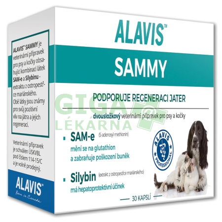 Způsob použitíKapsle se podávají denně dle doporučeného dávkování do tlamy zvířete či s malým kouskem potravy. Kapsli je možné rozdělat a obsah smíchat s vodou či s malým kouskem potravy. Přípravek podávejte alespoň 60 minut před podáním stravy. Délka podáváníPři akutním zánětu jater či při pankreatitidě podávejte přípravek ALAVIS™ SAMMY po dobu 1–3 měsíců denně, při chronických jaterních potížích podávejte přípravek denně po dobu 2–3 měsíců a u vysoce rizikových pacientů či u pacientů s výrazným poškozením jater podávejte přípravek 2× týdně dlouhodobě po 1–3 měsíční denní kúře. Účinné látky obsažené v 1 kapsli:L-cholin 124 mg, L-methionin 100 mg, Silybin (extrakt z ostropestřce mariánského) 24 mg. Pomocné látky: Mikrokrystalická celulóza, hořečnaté soli mastných kyselin.