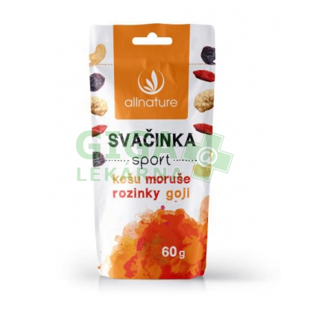 Směs suchých skořápkových ploů a zpracovaného ovoce. Složení Allnature Směs svačinka sport 60gKešu ořechy jádra - minimálně 5%, rozinky (rozinky sultánky, slunečnicový olej) - minimálně 5%, moruše bílá sušená bio - minimálně 5%, goji plody (bobule kustovnice čínská sušená, konzervant: oxid siřičitý) - minimálně 5%.