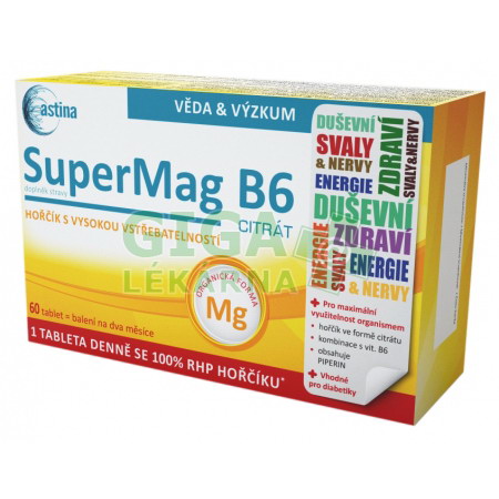 Složení: SuperMag B6 citrát obsahuje 375 mg čistého ionizovatelného hořčíku v jedné tabletě, což je 100% referenční hodnoty příjmu (dříve doporučené denní dávky) Dávkování Astina SuperMag B61 tableta denně před jídlem, důkladně zapít tekutinou. UpozorněníPřípravek je určen pro dospělé a děti od 14 let. Balení Astina SuperMag B660 tablet = balení na dva měsíce |
