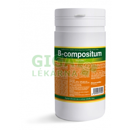 Nejprve se denní dávka rozpustí v menším množství vody v poměru 1 : 10 a dále se tento roztok přidává do napáječek nebo zásobníku. Roztok se před každým použitím připravuje čerstvý. Při podávání v krmivu je nutné dávku rovnoměrně zamíchat. SloženíSložení B-composita v 1 kg: vitamin B1 3 000 mg, vitamin B26 000 mg, vitamin B6 5 000 mg, vitamin B12 10 mg, niacinamid 40 000 mg, pantothenan vápenatý 15 000 mg, biotin 40 mg, inositol 2 000 mg, kyselina listová 100 mg, betain 50 mg. Balení B-compositumBalení obsahuje 1 kg B komposita. | ||||||||||||||||||||||||||||||||||||||||||||||||||||||||||||||||