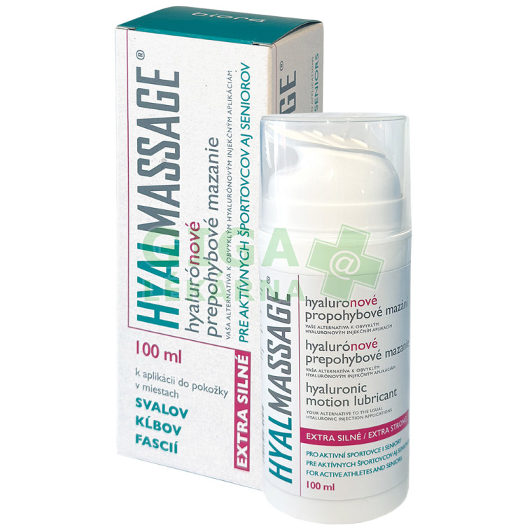 Jedno balení tak vystačí až na 100 jednotlivých aplikací. PoužitíPropohybové mazání Hyalmassage na bázi komplexu vysokomolekulární kyseliny hyaluronové (biora) aplikujte alespoň 2x denně, vždy do čisté a nejelépe suché pokožky v místech svalů, kloubů, zad, vaziva, či fascií, rovnoměrným nanesením na určenou plochu a důkladně vmasírujte, vždy až do úplného vstřebání - tj. ztráty pocitu kluzkosti.