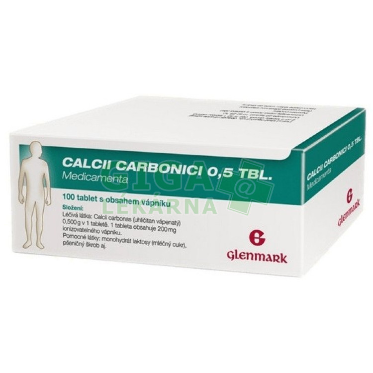 Zvláštní opatrnosti při použití Calcii carbonici 0,5 tbl je zapotřebí Pacienti s achlorhydrií (nepřítomností kyseliny chlorovodíkové v žaludeční šťávě,bývá spojena s vleklým zánětem žaludku) by měli přípravek užívat mezi jídlem. Při dlouhodobém užívání jsou nutné laboratorní kontroly vápníku v krvi a v moči. Bez porady s lékařem neužívejte žádné přípravky obsahující vápník nebo vitamín D. Vzájemné působení s dalšími léčivými přípravky Prosím, informujte svého lékaře nebo lékárníka o všech lécích, které užíváte nebo jste užíval(a) v nedávné době, a to i o lécích, které jsou dostupné bez lékařského předpisu. Perorální podávání vápníku (podání ústy) snižuje vstřebávání některých antibiotik, zejména tetracyklinu a vitamínů rozpustných v tucích (např. vitamín A a D). Při současném podávání těchto přípravků musíte zachovat tříhodinový odstup. Vápník zesiluje účinek srdečních glykosidů např. digoxinu. Neužívejte společně s preparáty fluoru, zejména fluoridem sodným. Vstřebávání vápníku z trávicí soustavy snižuje kyselina šťavelová, fytová a soli draslíku a sodíku. Užívání přípravku Calcii carbonici 0,5 tbl s jídlem a pitím Tablety užívejte po jídle a zapijte dostatečným množstvím tekutiny, polykají se celé nebo rozdělené. Těhotenství a kojení Poraďte se se svým lékařem nebo lékárníkem dříve, než začnete užívat jakýkoliv lék. Těhotné a kojící ženy mohou přípravek užívat na základě doporučení lékaře. Řízení dopravních prostředků a obsluha strojů Přípravek Calcii carbonici 0,5 tbl nemá žádný vliv na schopnost řídit nebo obsluhovat stroje. Důležité informace o některých složkách přípravku Calcii carbonici 0,5 tbl Přípravek Calcii carbonici 0,5 tbl obsahuje monohydrát laktosy. Pokud Vám Váš lékař řekl, že nesnášíte některé cukry, poraďte se se svým lékařem, než začnete tento léčivý přípravek užívat. 3. Jak se přípravek CALCII CARBONICI 0,5 TBL užíváObvyklá dávka přípravku je pro dospělé 2 - 4 tablety denně při preventivním podávání, při léčebném lze dávkování zvýšit podle doporučení lékaře. Dětem se podává 1/2 - 1 tableta denně. Bez porady s lékařem neužívejte (nepodávejte dětem) současně další přípravky obsahující minerály. Tablety se polykají celé nebo rozdělené a zapíjejí se dostatečným množstvím tekutiny. Jestliže jste užil(a) více přípravku Calcii carbonici 0,5 tbl, než jste měl(a) Předávkování přípravkem může způsobit příznaky, jako jsou pocit na zvracení, zvracení, bolest břicha nebo zácpa. Pokud máte podezření na předávkování, vyhledejte ihned svého lékaře. Jestliže jste zapomněl(a) užít přípravek Calcii carbonici 0,5 tbl Nezdvojujte následující dávku, abyste nahradil(a) vynechanou dávku. Máte-li jakékoli další otázky, týkající se užívání tohoto přípravku, zeptejte se svého lékaře nebo lékárníka. 4. Možné nežádoucí účinkyPodobně jako všechny léky, může mít i přípravek Calcii carbonici 0,5 tbl nežádoucí účinky, které se ale nemusí vyskytnout u každého. Přípravek je obvykle dobře snášen, někdy se však mohou vyskytnout potíže jako zácpa, při dlouhodobém podávání vysokých dávek existuje možnost poškození ledvin. Při nadměrných dlouhodobých dávkách podávaných během těhotenství hrozí hyperkalcémie plodu. 5. Jak přípravek CALCII CARBONICI 0,5 TBL uchovávatUchovávejte při teplotě 10 až 25°C. Uchovávejte mimo dosah a dohled dětí. Přípravek Calcii carbonici 0,5 tbl nepoužívejte po uplynutí doby použitelnosti, uvedené na krabičce a blistru. Doba použitelnosti se vztahuje k poslednímu dni uvedeného měsíce. Léčivé přípravky se nesmí vyhazovat do odpadních vod nebo domácího odpadu. Zeptejte se svého lékárníka, jak máte likvidovat přípravky, které již nepotřebujete. Tato opatření pomáhají chránit životní prostředí. 6. Další informaceCo přípravek Calcii carbonici 0,5 tbl obsahuje