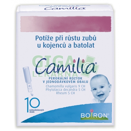 | Popis: | Jedná se o humánní léčivý přípravek, takže doporučujeme pečlivé pročtení příbalové informace (tzv. příbalový leták). Příbalový leták Camilia perorální roztok por.sol.mdc.10x1ml1. CO JE CAMILIA A K ČEMU SE POUŽÍVÁCAMILIA je homeopatický léčivý přípravek užívaný tradičně v homeopatii ke zmírnění potíží spojených s růstem zubů u kojenců a batolat (jako jsou např. bolesti při prořezávání zubů, podrážděnost, červené tváře, průjem).