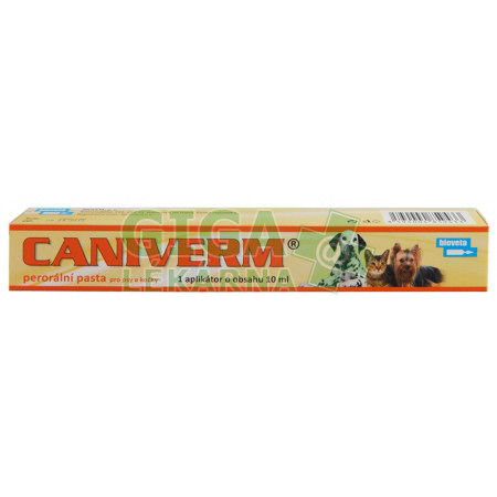 CANIVERM perorální pasta je určena pouze k perorálnímu podání. 9. POKYNY PRO SPRÁVNÉ PODÁNÍAplikátor je třeba přizpůsobit vypočítané dávce dle výše uvedeného schématu nastavením kroužku na příslušné místo pístu: Držte píst stříkačky, rýhovaný dávkovací kruh otáčením posuňte po pístu tak, aby spodní hrana kruhu byla v zákrytu s ryskou požadovaného objemu. Ujistěte se, že zvíře nemá v tlamě žádné zbytky potravy. Odstraňte uzávěr aplikátoru, vložte jej do tlamy a naneste pastu na kořen jazyka. Po aplikaci okamžitě na několik vteřin zvedněte hlavu zvířete a ujistěte se, že zvíře dávku spolklo. Nepodávat současně s mléčnou potravou. Dávka se podává jednorázově. U mláďat se doporučuje odčervovat od 3. do 12. týdne stáří jednorázově v intervalu 3 týdnů a pak pravidelně každé 3 měsíce. 10. OCHRANNÁ LHŮTANení určeno pro potravinová zvířata. 11. ZVLÁŠTNÍ OPATŘENÍ PRO UCHOVÁVÁNÍUchovávat mimo dohled a dosah dětí. 12. ZVLÁŠTNÍ UPOZORNĚNÍZvláštní opatření pro použití u zvířat: