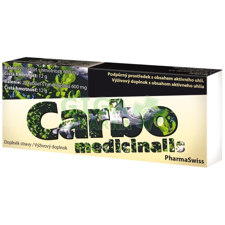 Užívá se jako podpůrný prostředek při trávících potížích - nadýmání, větrech, nadměrnému rozkladu potravy ve střevech, průjmech po dietní chybě. SloženíAktivní uhlí, plnidlo sacharóza, stabilizátor povidon, protispékavá látka, stearan hořečnatý. 1 tableta obsahuje 300 mg aktivního uhlí (carbo activatus). Dávkování Carbo medicinalis PharmaSwissReferenční hodnota příjmu (doporučená denní dávka) je 1x denně 3 tablety alespoň 30 min. před jídlem, anebo 3 tablety po jídle po dobu obtíží (jako podpůrný prostředek).