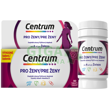 Bez lepku. Bez cukrů. Doporučená denní dávkaDoporučená denní dávka pro dospělé: 1 tableta denně. Složení Centrum pro ženy tbl.90Hydrogenfosforečnan vápenatý, uhličitan vápenatý, oxid hořečnatý, plnidla: mikrokrystalická celulosa, hydroxypropylmethylcelulosa, polydextrosa, vitamín C (L-askorbová kyselina), protispékavé látky: zesíťovanou sodnou sůl karboxymethylcelulosy, oxid křemičitý, talek, fumaran železnatý, nikotinamid, vitamín E (DL-alfa-tokoferylacetát), D-pantothenan vápenatý, oxid zinečnatý, síran manganatý, emulgátor: hořečnaté soli mastných kyselin, vitamín B6 (pyridoxin-hydrochlorid), vitamín B2 (riboflavin), želatinu, Vitamín B1 (thiamin-mononitrát), betakaroten, rostlinný olej (kokosový a palmový olej), síran měďnatý, vitamín A (retinyl-acetát), kyselinu listovou (pteroylmonoglutamovou), chlorid chromitý, molybdenan sodný, jodid draselný, selenan sodný, biotin (D-biotin), antioxidant: butylhydroxytoluen, vitamin K (fytomenadion), vitamín D (cholekalciferol), vitamín B12 (cyanokobalamin), oxid titaničitý, košenilu, brilantní modř FCF. Složení Centrum pro ženy tbl.90