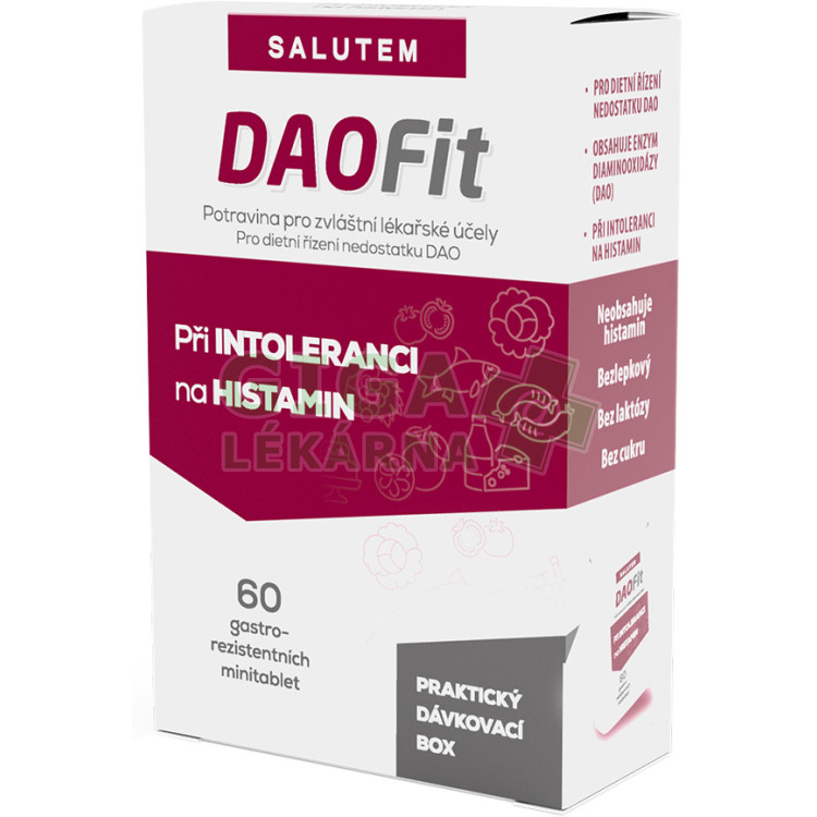 Složení DAOFit tbl.60 CZE SalutemObjemová látka: mikrokrystalická celulóza a hydroxypropylcelulóza; proteinový extrakt vepřových ledvin se 7 % diaminooxidázy (DAO); leštící činidlo: ethylcelulóza; bramborový škrob; stabilizátory: alginát sodný a hořečnaté soli mastných kyselin; triglyceridy se středním řetězcem; leštící látka: hydroxypropylmethylcelulóza; stabilizátory: kyselina olejová a kyselina stearová. Doporučený denní příjem:1 tabletu zapijte trochou vody 20 minut před hlavními jídly (max. 3x denně). Polykejte celé, bez žvýkání, dělení nebo lámání. UpozorněníDAOfit není vhodný k použití jako jediný zdroj výživy. Používejte na doporučení lékaře nebo lékárníka. Držet mimo dosah dětí. Skladujte na chladném místě. Tablety musí být spolknuty celé. Hmotnost obsahu:3,36 g. Balení DAOFit60 gastro-rezistentních (enterosolventních) minitablet Baleno v praktickém dávkovacím boxu na minitablety (dispenseru). |