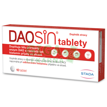 *Odpovídá doporučené dávce pro jedno jídlo obsahující histamin **Odpovídá maximální denní dávce doporučené pro tři jídla obsahující histamin. Doporučené dávkováníDoporučená dávka je 1 tableta 15 minut před jídlem obsahujícím histamin, zapijte vodou. Obsah tablety nesmíte před polknutím rozžvýkat a tabletu je třeba polknout celou, aby byl umožněn průchod tablety žaludkem a účinná látka se dostala do střeva. Složení DAOSiN tablety tbl.10Obsahuje bezhistaminový extrakt bílkoviny (bohatý na přírodní DiAminoOxidázu).