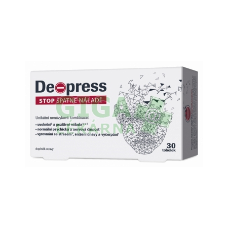 | Upozornění: | Přípravek De-press 30 tobolek je registrovaný jako doplněk stravy. Nemá schválené léčivé účinky a nejedná se o lék. Doplňky stravy nejsou určeny jako náhrada pestré stravy. Nepřekračujte doporučené dávkování. |