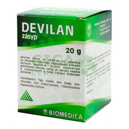 Přípravek je dermatologicky testován. PoužitíPokožku nejprve dobře omyjte a osušte a poté zasypte přiměřeným množstvím přípravku. Používejte 1-3x denně. PříznakySvědění, pálení mezi prsty dolních kočetin. KontraindikacePřecitlivělost na složky přípravku. Nepoužívat na silně mokvající choroboplodlné procesy. Složení Devilan zásyp 20gTalc, Kaolin, Zinc Oxide, Magnesium Stearate, Zinc Undecylenate, Chlorhexidine Digluconate, Aqua, Parfum. SkladováníUchovávejte v suchu při teplotě do + 25 °C. Chraňte před přímým účinkem slunečních paprsků a před mrazem. Uchovávejte zásyp z dosahu nosu a úst dětí. Balení Devilan zásyp20 g. |
