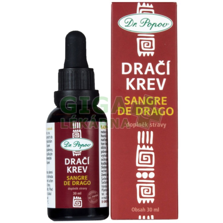 Dračí krev je výborná pro posílení imunity (díky antioxidantům), ale také na celou řadu kožních potíží. PoužitíVnější užití při kožních problémech a poranění, poštípání hmyzem, akné, bradavicích, apod. Kloktání – při problémech v ústní dutině, na dásně, zuby, mandle apod. Vnitřní užití - Dračí krev obsahuje celou řadu dalších účinných látek, které z ní činí výjimečného přírodního pomocníka se širokým spektrem pozitivních účinků na lidské zdraví. Dávkování Dr.Popov Kapky Dračí krev-Sangre de DragoPřed použitím protřepat, lehký zákal není na závadu.