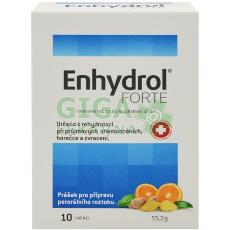 Enhydrol FORTE je rehydratační roztok se složením doporučeným ESPGHAN pro kojence a děti od ukončeného 4. měsíce věku. Užívá se pro doplnění vody a elektrolytů u stavů hrozících odvodněním organismu, jako je průjem, horečka či zvracení. Rehydratační roztok je ochucen přírodní pomerančovou příchutí pro zlepšení příjmu roztoku zejména dětskými pacienty. Obsahuje zázvorový extrakt, který uklidňuje žaludek a mírní nutkání ke zvracení. Díky antiemetickému (proti zvracení) účinku zázvorového extraktu lze Enhydrol FORTE použít pro rehydrataci při onemocněních, která doprovází podráždění žaludku a nebo při cestování.