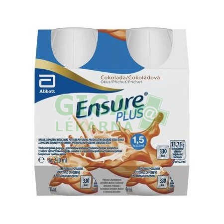 Návod k použitíPřipraveno k použití. DOBŘE PROTŘEPEJTE. Po otevření uzavřete, uchovávejte v chladničce a spotřebujte do 24 hodin. Důležité upozorněníTento produkt je vhodný jako jediný nebo doplňkový zdroj výživy a je nutno jej používat na základě doporučení lékaře nebo osoby kvalifikované v oblasti lidské výživy, farmacie nebo odborníka na péči o matku a dítě. Není určeno pro děti, pokud použití nedoporučil lékař nebo jiný kvalifikovaný zdravotnický pracovník. Neužívat při galaktosémii. Není určeno k parenterálnímu použití. Bez lepku. Složení Ensure Plus čokoládová příchuť por.sol.4x220mlVoda, maltodextrin, hydrolyzovaný kukuřičný škrob, sacharóza, mléčné bílkoviny, rostlinné oleje (řepkový, kukuřičný), kakaový prášek, izolovaná sójová bílkovina, minerály (citronan sodný, fosforečnan vápenatý, chlorid draselný, chlorid hořečnatý, hydrogenfosforečnan hořečnatý, citronan draselný, síran železnatý, síran zinečnatý, síran manganatý, síran měďnatý, jodid draselný, molybdenan sodný, chlorid chromitý, selenan sodný), stabilizátory (E460, E466, E418), emulgátor: sójový lecitin, cholinchlorid, vitamíny (C, E, niacinamid, pantothenan vápenatý, B6, B1, B2, vitamín A palmitát, beta-karoten, kyselina listová, K1, biotin, D3, B12), aroma.