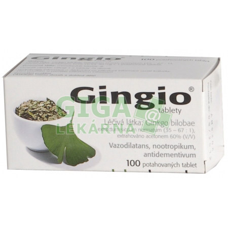 Časté: točení hlavy, průjem, bolesti břicha, pocit na zvracení, zvracení Není známo: krvácení jednotlivých orgánů (oko, nos, krvácení do mozku a zažívacího traktu), reakce z přecitlivělosti (alergický šok), alergické kožní reakce (zarudnutí kůže, otok kůže, svědění, vyrážka). Hlášení nežádoucích účinkůPokud se u Vás vyskytne kterýkoli z nežádoucích účinků, sdělte to svému lékaři nebo lékárníkovi. Stejně postupujte v případě jakýchkoli nežádoucích účinků, které nejsou uvedeny v této příbalové informaci. Nežádoucí účinky můžete hlásit také přímo na adresu: Státní ústav pro kontrolu léčiv, Šrobárova 48, 100 41 Praha 10, webové stránky: www.sukl.cz/nahlasit-nezadouci-ucinek. Nahlášením nežádoucích účinků můžete přispět k získání více informací o bezpečnosti tohoto přípravku. 5. Jak přípravek Gingio uchovávatUchovávejte při teplotě do 30 °C. Uchovávejte v původním obalu, aby byl přípravek chráněn před světlem a vlhkostí. Uchovávejte tento přípravek mimo dohled a dosah dětí. 6. Obsah balení a další informaceCo přípravek Gingio tablety obsahujeLéčivou látkou je Ginkgo extractum siccum raffinatum et quantificatum (čištěný a kvantifikovaný suchý jinanový extrakt) Jedna potahovaná tableta obsahuje: Ginkgo extractum siccum raffinatum et quantificatum (35 - 67:1), extrahováno acetonem 60% (V/V) 40 mg (odpovídá 8,8 – 10,8 mg flavonových glykosidů a 2,16 – 2,64 mg terpenolaktonů – gingkolidů a bilobalidu). Pomocnými látkami jsou: mikrokrystalická celulosa, monohydrát laktosy, tekutá glukosa usušená rozprášením, makrogol 4000, magnesium-stearát, kukuřičný škrob, hypromelosa, sodná sůl karboxymethylškrobu (typ A), koloidní bezvodý oxid křemičitý, oxid titaničitý (E 171), žlutý oxid železitý (E 172). Jak přípravek Gingio tablety vypadá a co obsahuje toto balení30, 50, 60, 90, 100 a 120 potahovaných tablet. PP/Al blistry, čiré průhledné, papírová krabička. Popis přípravku: kulaté bikonvexní okrově až okrově hnědé skvrnitě zbarvené potahované tablety s půlící rýhou na jedné straně. Tabletu lze rozdělit na stejné dávky.