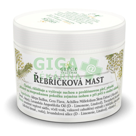 Složení Grešík mast Řebříčková 50mlNesolené vepřové sádlo, včelí vosk, vakuově zahuštěný extrakt z řebříčku obecného (alkohol denat., voda), levandulová silice (D - Limonene, Linalool), vitamín E. Balení Grešík mast Řebříčková50 ml |