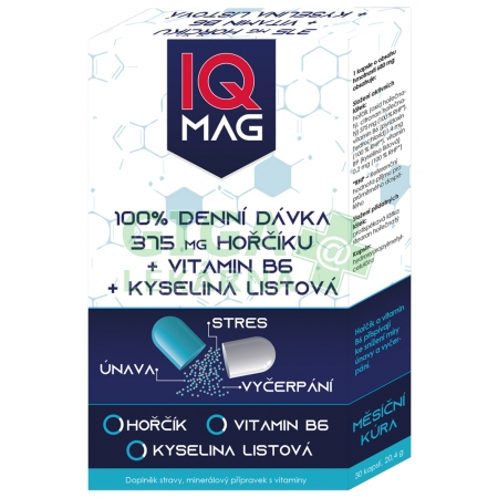 | Upozornění: | Přípravek IQ Mag hořčík 375 mg + B6 + kys.listová 60tob je registrovaný jako doplněk stravy. Nemá schválené léčivé účinky a nejedná se o lék. Doplňky stravy nejsou určeny jako náhrada pestré stravy. Nepřekračujte doporučené dávkování. |
