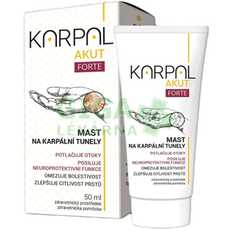PoužitíPřípravek je určený k lokální aplikaci a k masáži zápěstí, ruky a předloktí. Přiměřené množství masti naneste a krouživými pohyby vmasírujte do kůže zápěstí a vnitřní strany předloktí. Doporučuje se aplikovat 2x denně nebo vícekrát v průběhu dne dle intenzity obtíží (maximálně 5x denně). Složení KARPAL AKUT FORTE 50mlAktivní látky