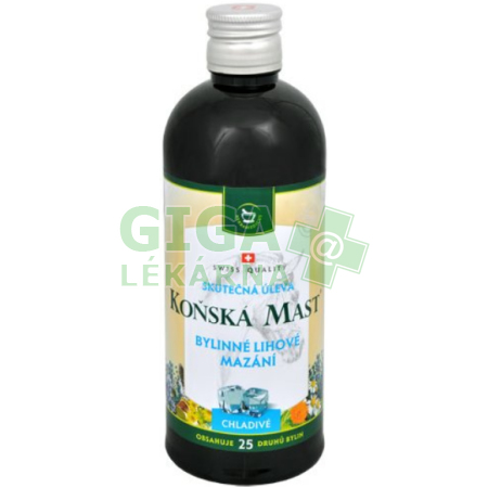 Koňská mast Bylinné lihové mazání chladivé má osvěžující účinek, díky němuž ulevuje od pocitu „těžkých nohou“. Lze ji používat během celého dne, zvláště pak po zátěži pohybového aparátu. Lihové mazání chladivé vyvolává intenzivní osvěžení a prokrvení, čímž se zvyšuje působení účinných látek a urychluje rekonvalescence.