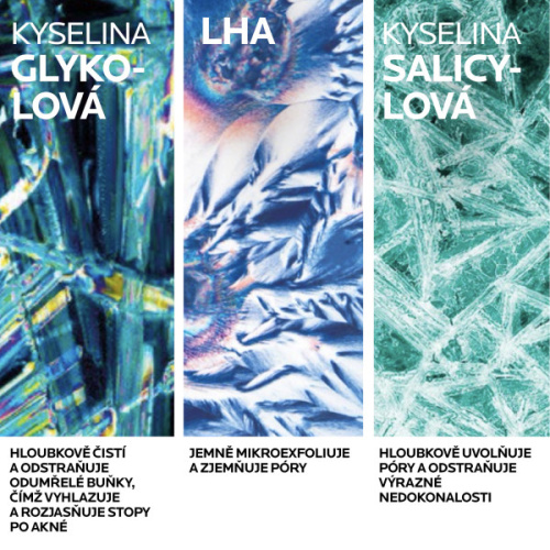 Spojení vysoké koncentrace synergických aktivních látek: 3 keratolytické kyseliny (LHA, kyselina salicylová, kyselina glykolová) pro zmírnění nedokonalostí pleti a stop po akné + Niacinamidu & Termální vody z La Roche-Posay pro zklidňující účinek a proti začervenání.