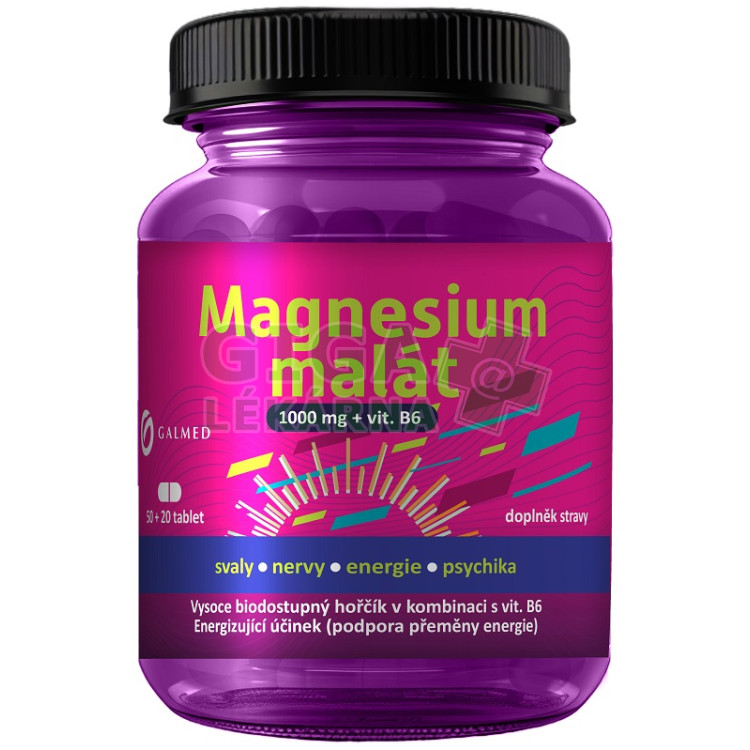 Doporučené denní dávkování1-3 tablety denně. Složení Magnesium malát tbl.50+20 GalmedJablečnan hořečnatý, citronan draselný (stabilizátor). Uhličitan vápenatý, mikrokrystalická celulóza, maltodextrin (plnidla). Stearan hořečnatý, mastné kyseliny, sodná sůl kroskarmelózy, oxid křemičitý (protispékavé látky), sodná sůl karboxymethylcelulózy (zahušťovadlo), pyridoxin-hydrochlorid. Potah (PVA, HPMC). UpozorněníNení náhradou pestré stravy. Není vhodné pro děti z důvodu velikosti tablety. Balení Magnesium malát50 + 20 tablet. |