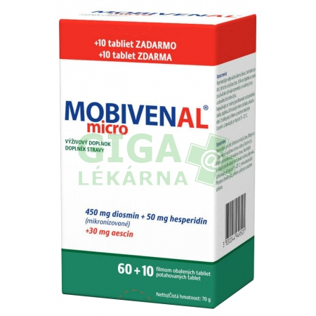 | Upozornění: | Přípravek Mobivenal Micro tbl.60+10 je registrovaný jako doplněk stravy. Nemá schválené léčivé účinky a nejedná se o lék. Doplňky stravy nejsou určeny jako náhrada pestré stravy. Nepřekračujte doporučené dávkování. |