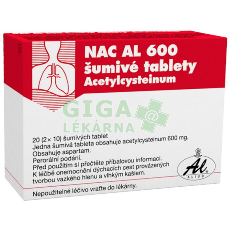 | Popis: | Jedná se o humánní léčivý přípravek, takže doporučujeme pečlivé pročtení příbalové informace (tzv. příbalový leták). Příbalový leták NAC AL 600 Šumivé Tablety por.tbl.eff.20x600mg1. Co je přípravek NAC AL a k čemu se používáAcetylcystein, léčivá látka přípravku NAC AL, zkapalňuje hustý hlen v průduškách a podporuje jeho vykašlávání. Přípravek NAC AL se užívá u dospělých a dospívajících od 14 let k léčbě akutních a chronických onemocnění dýchacích cest provázených tvorbou vazkého hlenu a vlhkým kašlem, jako je např. zánět průdušnice nebo zánět průdušek (bronchitida). U akutních onemocnění lze přípravek užívat bez porady s lékařem, u chronických onemocnění se přípravek může užívat pouze na doporučení lékaře. Dále se přípravek NAC AL užívá u dospělých, dospívajících a dětí od 2 let k léčbě mukoviscidózy (vrozené onemocnění žláz se zevní sekrecí, projevující se mj. poruchou zkapalňování hlenů v dýchacích cestách). V tomto případě se přípravek užívá pouze na doporučení lékaře. Pokud se do 5 dnů nebudete cítit lépe nebo pokud se Vám přitíží, musíte se poradit s lékařem. 2. Čemu musíte věnovat pozornost, než začnete přípravek NAC AL užívatNeužívejte přípravek NAC AL: Upozornění a opatření Další léčivé přípravky a přípravek NAC AL Pro současné užívání přípravku NAC AL a přípravků, které kašel tlumí (antitusika, např. dextromethorfan nebo kodein) musí být zvlášť závažné důvody a o takové léčbě musí vždy rozhodnout lékař, protože může dojít k nebezpečnému hromadění hlenu v dýchacích cestách. Antitusika můžete užívat současně s NAC AL pouze na přímé doporučení lékaře. Při současném perorálním užívání (tj. užívání ústy) některých antibiotik (tetracyklinu, polosyntetických penicilinů, aminoglykosidů, cefalosporinů) musíte NAC AL užívat s odstupem nejméně 2 hodin. Je vhodné zachovávat tento odstup i u jiných antibiotik (neplatí to však pro amoxicilin, doxycyklin, erythromycin, thiamfenikol a cefuroxim). Současné podávání NAC AL a nitroglycerinu může zesílit působení nitroglycerinu na rozšíření cév a zvýšit útlum shlukování krevních destiček. Těhotenství, kojení a plodnost Řízení dopravních prostředků a obsluha strojů Přípravek NAC AL obsahuje sodík. Přípravek NAC AL obsahuje aspartam. 3. Jak se přípravek NAC AL užíváVždy užívejte tento přípravek přesně v souladu s příbalovou informací nebo podle pokynů svého lékaře nebo lékárníka. Pokud si nejste jistý(á), poraďte se se svým lékařem nebo lékárníkem. Dávkování u onemocnění dýchacích cest provázených tvorbou hlenu a vlhkým kašlem: Bez porady s lékařem lze přípravek užívat nejdéle 5 dnů. Pokud se do 5 dnů nebudete cítit lépe nebo pokud se Vám přitíží, musíte se poradit s lékařem. Dávkování při mukoviscidóze: Děti od 2 do 6 let: 1 x denně 1/2 šumivé tablety Způsob podání: Tablety se užívají rozpuštěné ve sklenici vody. Pro zvýšení účinku přípravku na rozpuštění hlenu je vhodné zvýšit příjem tekutin během dne. Jestliže jste užil(a) více přípravku NAC AL, než jste měl(a) Jestliže jste zapomněl(a) užít přípravek NAC AL Máte-li jakékoli další otázky týkající se užívání tohoto přípravku, zeptejte se svého lékaře nebo lékárníka. 4. Možné nežádoucí účinkyPodobně jako všechny léky může mít i tento přípravek nežádoucí účinky, které se ale nemusí vyskytnout u každého. Zcela ojediněle se může objevit pálení žáhy, nevolnost, zvracení a průjem. V ojedinělých případech došlo k zánětům sliznice dutiny ústní, k bolestem hlavy a hučení v uších. Ojediněle se vyskytly reakce z přecitlivělosti, např. svědění, kopřivka, kožní vyrážka, zúžení průdušek, zrychlení srdečního tepu a pokles krevního tlaku; ojedinělé zprávy o zúžení průdušek se týkaly převážně pacientů se zvýšenou reaktivitou průdušek při průduškovém astmatu. V souvislosti s podáváním acetylcysteinu byly ojediněle hlášeny případy krvácení, a to částečně jako součást projevů celkové reakce z přecitlivělosti. Hlášení nežádoucích účinků Státní ústav pro kontrolu léčiv Webové stránky: www.sukl.cz/nahlasit-nezadouci-ucinek 5. Jak přípravek NAC AL uchovávatUchovávejte tento přípravek mimo dohled a dosah dětí. Po prvním otevření tuby spotřebujte tablety do 3 měsíců. Nevyhazujte žádné léčivé přípravky do odpadních vod nebo domácího odpadu. Zeptejte se svého lékárníka, jak naložit s přípravky, které již nepoužíváte. Tato opatření pomáhají chránit životní prostředí. 6. Obsah balení a další informaceCo přípravek NAC AL obsahuje Jak přípravek NAC AL vypadá a co obsahuje toto balení Velikost balení : |