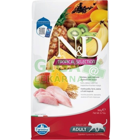 Doplňující informace ke krmivu NDFarmina N&D je přírodní a pro kočky je lahodné krmivo, které reflektuje filozofii italského prémiového výrobce krmiv Farmina: Promyšlená receptura od první až po poslední surovinu, zcela bez umělých konzervačních látek, zmražených či geneticky upravených surovin. Složení ND TROPICAL SELECTION CAT Adult Chicken 300gvykostěné kuře (22%), dehydratovaný kuřecí protein (20%), špalda (12%), oves (12%), dehydratovaný protein ze sledě, sušená vejce, kuřecí tuk, sušené řepné řízky, rybí olej (ze sledě), sušená vojtěška, sušené mrkve, inulin, fruktooligosacharidy, extrakt z kvasnic (zdroj mannanoligosacharidů), sušený banán (0.5%), sušené kiwi (0.5%), sušené mango (0.5%), sušená papája (0.5%), sušený ananas (0.5%), sušený špenát, semena a slupky psyllia, chlorid sodný, sušené pivovarské kvasnice, kurkuma. Nutriční doplňkové látky:Vitamín A 16000IU; Vitamín D3 1600IU; Vitamín E 160mg; Vitamín C 160mg; Niacin 40mg; Kalcium D-Pantothenát 16mg; Vitamín B2 8mg; Vitamín B6 6.4mg; Vitamín B1 4.8mg; Biotin 0.4mg; Kyselina listová 0.48mg; Vitamín B12 0.06mg; Cholin chlorid 2200mg; Zinek (oxid zinečnatý): 86.7mg; Zinek (monohydrát síranu zinečnatého): 43.7mg; Mangan (monohydrát síranu manganatého): 48.8mg; Železo(II) (monohydrát síranu železnatého): 14.5mg; Železo(II) (uhličitan železnatý): 28.9mg; Měď(II) (pentahydrát síranu měďnatého): 12.8mg; Jód (anhydrát jodidu vápenatého): 1.56mg; DL-Metionin, technicky čistý 3000mg; Taurin 1800mg.