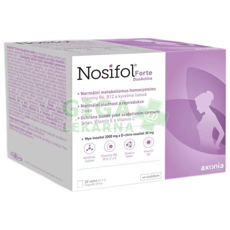 Po otěhotnění je u žen vhodné v užívání NosiFolu® Forte DuoActive pokračovat po celou dobu těhotenství. UpozorněníVýrobek je určen pro dospělé. Balení NosiFol Forte DuoActive sáčky30 sáčků po 4g prášku pro přípravu perorálního roztoku. |