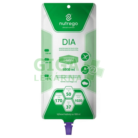 Nutričně kompletní výživa určena k podávání enterální sondou k dietnímu postupu klinické výživy v oblasti podvýživy a v riziku malnutrice. Pro pacienty s onemocněním diabetes mellitus nebo hyperglykemií. S nízkým glykemickým indexem, bez lepku, s vlákninou, s cukry a sladidly. Baleno v ochranné atmosféře a ošetřeno UHT. Dávkování nutrego DIA neutral por.sol.6x1000mlDoporučené dávkování pro celkovou výživu jsou minimálně 3 vaky sondové výživy (2 1500 ml, 1530 kcal/den), k doplňkové výživé se stravou je minimálně 1 vak sondové výživy (2 500 ml, 510 kcal/den). Není určeno k parenterálnímu (1.v.) podán Návod k použitíPřed použitím dobře protřepejte, skladujte na suchém a chladném místě, určeno k přímému použití Nemíchejte s léky. Po otevření ihned spotřebujte nebo uchovávejte v chladničce po dobu max. 24 hod. Nepoužívejte, pokud je vak poškozený, nafouklý nebo je-li obsah vysrážený. SloženíVoda, bílkoviny z kravského mléka, isomaltulóza, maltodextrin, inulin, triglyceridy se středně dlouhým řetězcem, řepkový olej, citronan vápenatý, citronan draselný, hydrogenfosforečnan hořečnatý, cholin bitartrát, citronan sodný, fosfát draselný, chlorid sodný, emulgátor E 471, aroma, L- askorban sodný, DL-a-tokoferyl-acetát, pyrofosforečnan železitý, chlorid chromitý, síran zinečnatý, molybdenan sodný, jodid draselný, nikotinamid, seleničitan sodný, síran manganatý, D-pantothenát vápenatý, retynil-acetát, kyanokobalamin, thiamin hydrochlorid, D-biotin, cholekalciferol síran mědnatý pyridoxin hydrochlorid, kyselina listová, riboflavin, fluorid sodný, fylochinon.