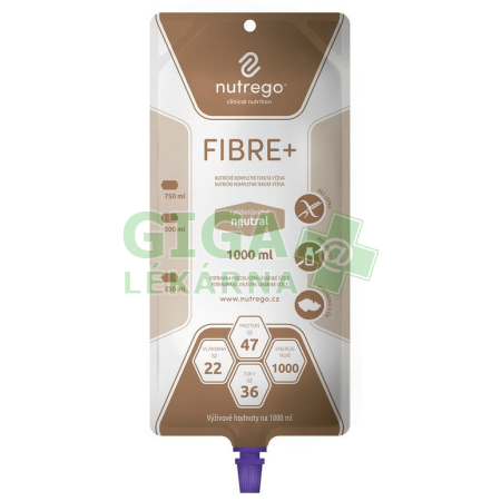Nutričně kompletní výživa určená k podávání enterální sondou k dietnímu postupu klinické výživy v oblasti podvýživy či v riziku malnutrice související s nemocí. Bez lepku, bez laktózy, s dietární vlákninou z čekanky. Baleno v ochranné atmosféře a sterilováno. Dávkování nutrego FIBRE+ neutral por.sol.6x1000mlDoporučené dávkování pro celkovou výživu jsou minimálně 3 vaky sondové výživy 1500 ml, 1500 kcal/den), k doplňkové výživě se stravou je minimálně 1 vak sondové výživy (≥ 500 ml, 500 kcal/den). Není určeno k parenterálnímu (i.v.) podání! Návod k použitíPřed použitím dobře protřepejte, skladujte na suchém a chladném místě, určeno k přímému použití. Nemíchejte s léky. Po otevření ihned spotřebujte, nebo uchovávejte v chladničce po dobu max. 24 hod. Nepoužívejte, pokud je vak poškozený, nafouklý nebo je-li obsah vysrážený. SloženíVoda, bílkoviny z kravského mléka, isomaltulóza, maltodextrin, inulin, triglyceridy se středně dlouhým řetězcem, řepkový olej, citronan vápenatý, citronan draselný, hydrogenfosforečnan hořečnatý, cholin bitartrát, citronan sodný, fosfát draselný, chlorid sodný, emulgátor E 471, aroma, L askorban sodný, DL-a-tokoferyl-acetát, pyrofosforečnan železitý, chlorid chromitý, zinečnatý, molybdenan sodný, jodid draselný, nikotinamid, seleničitan sodný, síran manganatý, D-pantothenát vápenatý, retynil-acetát, kyanokobalamin, thiamin hydrochlorid, D-biotin, cholekalciferol, síran měďnatý, pyridoxin hydrochlorid, kyselina listová, riboflavin, fluorid sodný, fylochinon.