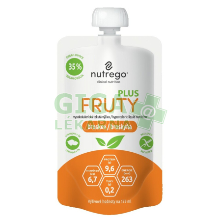Vysokokalorická nutričně nekompletní tekutá výživa s 35% obsahem ovoce a bohatá na vitamin D. Pouze k enterálnímu použití. Určeno k dietnímu postupu při podvýživě nebo riziku podvýživy. Vhodná pro pacienty v rámci dietního režimu s omezením tuků. Obsahuje zanedbatelné množství tuku. Obsahuje přirozenou vlákninu. Neobsahuje lepek. Důležité upozorněníPoužívejte na základě doporučení lékaře nebo osoby kvalifikované v oblasti výživy lidí. Není vhodný jako jediný zdroj výživy. Nepodávejte dětem do 3 let. Opatrnosti je třeba u dětí mezi 3. a 6. rokem věku. Nevhodné pro pacienty s galaktosémií. Ošetřeno pasterací. Skladujte na suchém a chladném místě. Před použitím protřepat. Určeno k přímému použití, nejlépe chutná vychlazený. Dávkování nutrego FRUTY PLUS broskev por.sol.4x175ml2 – 4 balení denně jako doplněk stravy. Složení nutrego FRUTY PLUS broskev por.sol.4x175mlOvocné pyré (jablko 25%, broskev 10%), voda, glukózový sirup, mléčná bílkovina, maltodextrin, cukr, regulátor kyselosti: kyselina fosforečná, citrát draselný, emulgátor E 471, citrát vápenatý, hydrogenfosforečnan sodný, cholin bitartrát, hydrogenfosforečnan draselný, chlorid hořečnatý, aroma, chlorid draselný, askorban sodný, broskvové aroma, kyselina L-askorbová, pyrofosforečnan železitý, chlorid chromitý, D-L-α-tokoferylacetát, síran zinečnatý, molybdenan sodný, nikotinamid, jodid draselný, seleničitan sodný, síran manganatý, retinyl-acetát, cholekalciferol , D-pantothenát vápenatý, síran měďnatý, D-biotin, kyselina listová, fluorid sodný, pyridoxin hydrochlorid, kyanobalamin, thiamin hydrochlorid, riboflavin, fylochinon.