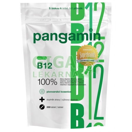 * % denní referenční hodnoty příjmu Dávkování Pangamin B12Dospělí 3x denně 4 tablety po jídle. Děti 3x denně 2 tablety po jídle. Návod k použitíTablety polknout a zapít dostatečným množstvím vody. SloženíKvasnice (obsahují lepek), sladový extrakt (obsahuje lepek), kvasničný extrakt [s obsahem - niacin (nikotinamid), cholin, kyselina pantothenová (D - pantothenan vápenatý), riboflavin (riboflavin), pyridoxin (pyridoxin hydrochlorid), thiamin (thiamin hydrochlorid), kyselina listová (kyselina listová a foláty 50:50), vitamín B12 (kyanokobalamin)], kvasnice s vitamínem D2, protispékavá látka (oxid křemičitý). UpozorněníNepřekračujte doporučenou denní dávku. Balení Pangamin B12200 tablet |