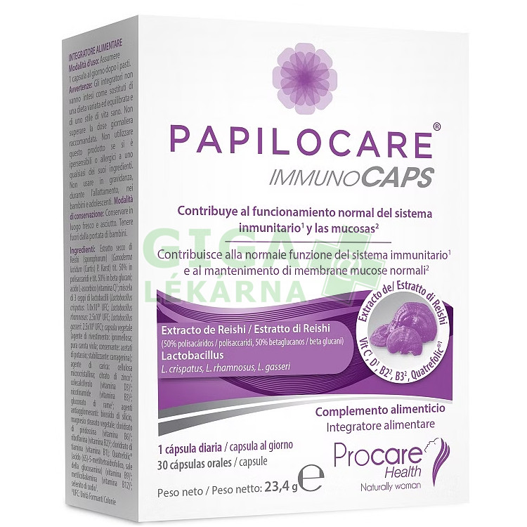 Výsledkem je aktivace imunitního systému, obnovení rovnováhy vaginální mikroflóry a zlepšení sliznice, čímž se vytvoří prostředí připravené k přirozenému odstranění viru z těla. Dávkování Papilocare ImmunocapsDoporučuje se užívat jej po dobu minimálně tří měsíců nebo déle na doporučení svého lékaře. Doporučená denní dávka je 1 kapsle Papilocare® Immunocaps během ranní snídaně. SloženíSuchý extrakt z houby Reishi (Ganoderma lucidum) (obsahuje 50 % polysacharidů, 50 % beta-glukanu); kapsle rostlinného původu (hydroxypropylmethylcelulóza); kyselina L-askorbová; živé kultury mikroorganismů (Lactobacillus crispatus, Lactobacillus rhamnosus, Lactobacillus gasseri); činidlo zadržující vlhkost: mikrokrystalická celulóza; citrát zinečnatý; cholekalciferol; nikotinamid; glukonát mědi; protispékavé látky: oxid křemičitý, stearan hořečnatý; přírodní barva: koncentrát fialové mrkvové šťávy; pyridoxin hydrochlorid; riboflavin; thiamin hydrochlorid; Quatrefolic® (kyselina (6S)-5-methyltetrahydrolistová, glukosaminová sůl); methylkobalamin, seleničitan sodný.