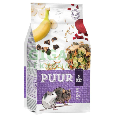 SloženíZrna (14,75 % oves), vedlejší produkty rostlinného původu (6 % svatojánský chléb), zelenina (1 % červená řepa), semena, ovoce (2 % banán), ořechy (2 % arašídy), maso a vedlejší produkty živočišného původu (1 % mouční červi), oleje a tuky, minerální látky. Analytické složkyHrubý protein 13,9 %, hrubý tuk 6,7 %, hrubá vláknina 8,6 %, hrubý popel 4,9 %, vápník 0,64 %, fosfor 0,29 %, sodík 0,01 %. Doplňkové látkyNutriční doplňkové látky (na 1 kg): vitamin A 3 750 IU, vitamin D3 400 IU, vitamin E 20 mg, vitamin C 5 mg, kyselina L-askorbová, (E1) železo 50 mg, (E4) měď 10 mg, (E5) mangan 20 mg, (E6) zinek 50 mg, (E8) selen 0,1 mg. Antioxidanty. Dávkování PUUR rat potkanPotkan potřebuje 15 gramů potravy denně, v závislosti na jejich životní fázi a zdravotní stav. Zajistěte neomezený přístup k čerstvé vodě. Balení PUUR rat potkan800 g. |