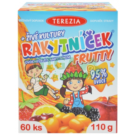 Ovocné želé RAKYTNÍČEK FRUTTY obsahují rakytník a směs ovocných koncentrátů a probiotika. RAKYTNÍK ŘEŠETLÁKOVÝ je vhodný na podporu obranyschopnosti organizmu, pomáhá snižovat únavu, podporuje činnost srdce a trávícího traktu, pomáhá udržovat zdravou pokožku.