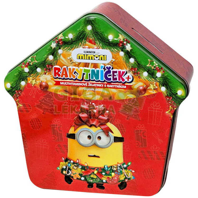 RAKYTNÍČEK+ želatinky - Vánoční domeček Mimoni 2024 je doplněk stravy obsahující aktivní látku rakytník a směs ovocných koncentrátů a vitaminy. Rakytník řešetlákový je vhodný na podporu obranyschopnosti organismu, pomáhá snižovat únavu, podporuje činnost srdce a trávicího traktu.
