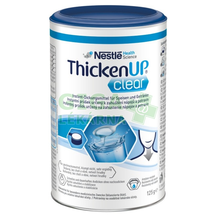 Neobsahuje lepek, laktózu a cholesterol. Dávkování:Při přidání následujícího množství Resource Thicken up vznikají tyto konzistence: Způsob použití:Za stálého míchání postupně přidávejte do nápoje nebo kašovitého pokrmu. Míchejte, dokud se prášek plně nerozpustí. Po chvíli se dosáhne žádaného stupně ztužení. Dosažená konzistence je stálá a nemění se zmrazením, zahřátím ani ochlazením. Při použití elektrického mixeru mixujte krátce při nízkých otáčkách. Kontraindikace:Nesmí se podávat při přecitlivělosti na některou složku, která je v přípravku obsažena. Důležité upozornění:Potravina musí být vždy používána na základě doporučení lékaře nebo kvalifikovaného pracovníka v oblasti klinické výživy. Nevhodné pro děti do 10 let. Není určeno k parenterálnímu použití. Uchování:Uchovávat v suchu a chladu. Po použití otevřenou plechovku pečlivě zavřete. Spotřebovat do 8 týdnů po otevření originálního balení. Datum použitelnosti viz zadní strana! |