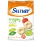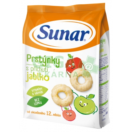 Potravina pro zvláštní výživu – potravina pro obilnou výživu kojenců a malých dětí od ukončeného 12. měsíce. Extrudovaný výrobek. Složení Sunar dětský snack jablkové prstýnky 50gKukuřičná mouka 49%, rýžová mouka 24%, cukr, minerální látky (uhličitan vápenatý), přírodní jablečné aroma, vitaminy (biotin, thiamin, B1, B6, riboflavin - B2, C, kyselina listová, niacin, E, B12, kyselina pantothenová). Může obsahovat stopy skořápkových plodů, sóji a mléka. Nutriční hodnotyna 100 gEnergie: 1 588 kJ / 374 kcal
