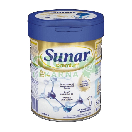 * z toho laktóza 6,8 g/100 ml připraveného mléka. UpozorněníDoporučené denní dávky mléka jsou orientační, řiďte se individuální potřebou dítěte a doporučením pediatra. Při krmení neponechávejte dítě bez dozoru, hrozí riziko zalknutí. Pro zdraví kojenců a malých dětí je důležité správné dodržování návodu na přípravu, používejte pouze přiloženou odměrku, neměňte poměr prášku a vody. Při nesprávném skladování a nedodržení správného návodu na přípravu může dojít k ohrožení zdraví dítěte. Sunar Premium 1 je počáteční mléčná kojenecká výživa v prášku. Je určen pro výživu kojenců od narození v období odstavování nebo nemohou být kojeni. Balení Sunar Premium700 g |