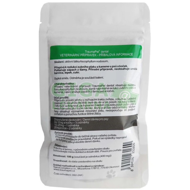 SloženíAktivní látka Ascophyllum nodosum. UpozorněníMořské řasy obsahují významné množství jódu, nedoporučuje se podávat zvířatům s poruchou funkce štítné žlázy. Balení TraumaPet dentalBalení obsahuje 100 g. Součástí je odměrka (400 mg). |