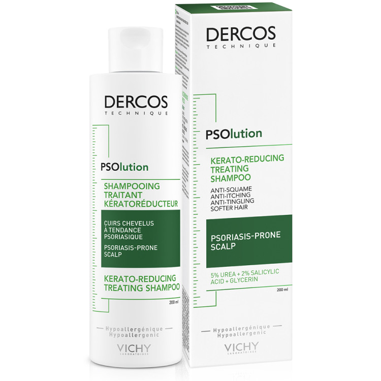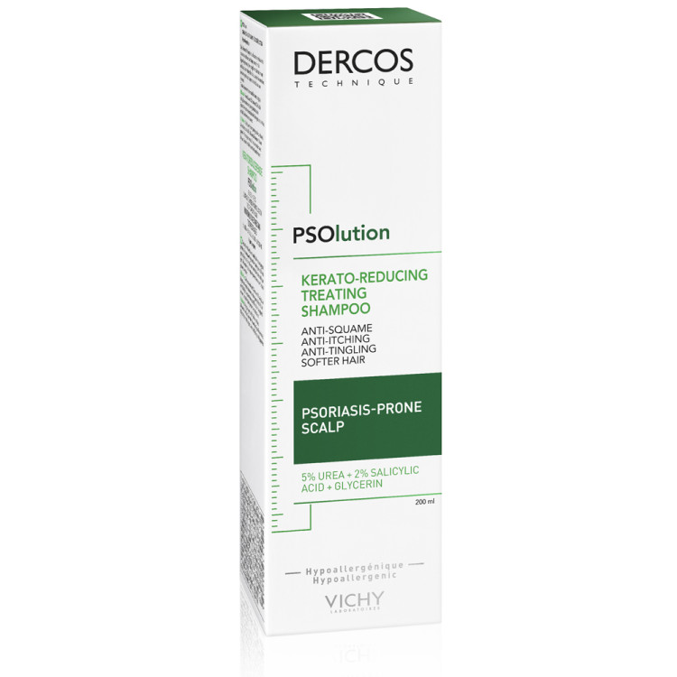 ÚčinnostObsahuje 5% urey a 2% kyseliny salicylové, které zklidňují a zvláčňují pokožku hlavy a působí proti tvorbě šupin. PoužitíVICHY DERCOS PSOlution šampon naneste na pokožku hlavy a mokré vlasy. Jemně masírujte, nechejte 2 minuty působit a opláchněte.