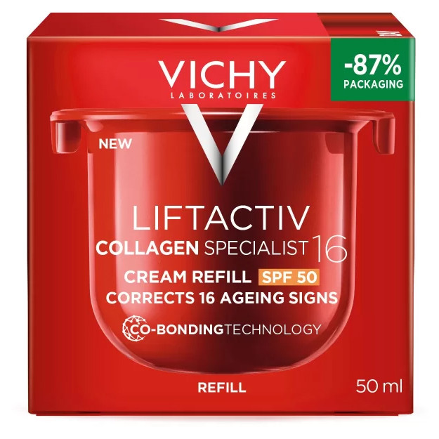 Při doplňování náplně do nádobky spotřebujete o 87 % méně obalů (méně skla, plastu a kartonu) než při nákupu celého nového krému Vichy Collagen Specialist 16 SPF50. PoužitíAplikujte ráno a vyhněte se oblasti očí.