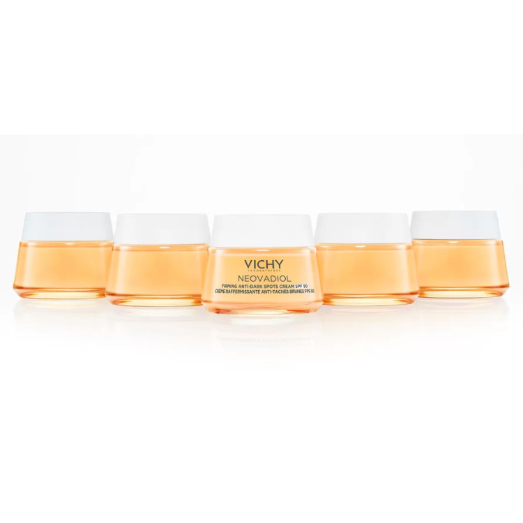 Hormonální změny po menopauze také oslabují přirozenou obranyschopnost pleti, která je tak zranitelnější vůči UV záření. To vede ke zhoršení známek fotostárnutí, jako jsou vrásky, tmavé skvrny a ztráta pevnosti pleti. Mimo to pleť ztrácí svůj jas a pružnost. Laboratoře Vichy vyvinuly nový Zpevňující krém Neovadiol proti tmavým skvrnám, který pleti poskytuje trojí účinek a reaguje na vaše potřeby v oblasti stařeckých skvrn, pevnosti a vrásek.