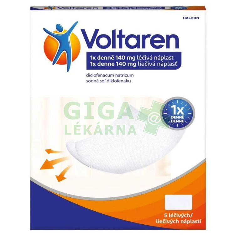 Po sejmutí léčivé náplasti nevystavujte léčenou oblast přímému slunečnímu záření nebo záření v soláriu, aby se snížilo riziko citlivosti na světlo. Nepoužívejte Voltaren 1x denně současně s jakýmikoli jinými léky obsahujícími diklofenak nebo jinými nesteroidními léky proti bolesti a zánětu bez ohledu na to, zda se aplikují místně nebo se užívají ústy. Děti a dospívající Další léčivé přípravky a Voltaren 1x denně Pokud se Voltaren 1x denně používá správně, vstřebá se do těla pouze malé množství diklofenaku, takže je nepravděpodobné, že by došlo ke vzájemnému působení s jinými léky, tak jak je popsáno u ústy užívaných léčiv obsahujících diklofenak. Těhotenství a kojení Těhotenství Kojení Řízení dopravních prostředků a obsluha strojů Voltaren 1x denně obsahuje butylhydroxyanisol (E 320) 3. Jak se Voltaren 1x denně používáVždy používejte tento přípravek přesně v souladu s příbalovou informací nebo podle pokynů svého lékaře nebo lékárníka. Pokud si nejste jistý(á), poraďte se se svým lékařem nebo lékárníkem. Doporučená dávka přípravku je jedna léčivá náplast jednou denně. Aplikujte jednu léčivou náplast na bolestivé místo. Maximální celková denní dávka je 1 léčivá náplast denně, a to i v případě, že máte více než jedno poraněné místo, které vyžaduje ošetření. Ošetřujte pouze jedno bolestivé místo, neošetřujte najednou více bolestivých míst. Způsob podání Návod k použití: Aplikace náplasti: Odstranění náplasti: V případě potřeby lze léčivou náplast upevnit na místě pomocí síťového obvazu. Léčivou náplast používejte pouze na zdravou a neporušenou kůži. Nepoužívejte léčivou náplast společně s neprodyšným (okluzivním) obvazem. Nepoužívejte náplast při koupání nebo sprchování. Délka léčby Jestliže jste použil(a) více přípravku Voltaren 1x denně, než jste měl(a) Jestliže jste zapomněl(a) použít Voltaren 1x denně Máte-li jakékoli další otázky, týkající se používání tohoto přípravku, zeptejte se svého lékaře nebo lékárníka. 4. Možné nežádoucí účinkyPodobně jako všechny léky, může mít i tento přípravek nežádoucí účinky, které se ale nemusí vyskytnout u každého. Okamžitě informujte svého lékaře a přestaňte používat náplast, pokud si všimnete některého z následujících příznaků: Mohou se u Vás vyskytnout následující nežádoucí účinky: Časté nežádoucí účinky (mohou postihnout až 1 z 10 osob): Velmi vzácné nežádoucí účinky (mohou postihnout až 1 z 10 000 osob): U pacientů, kteří lokálně používají léky ze stejné skupiny léčivých látek jako diklofenak, byly zaznamenány ojedinělé zprávy o celkové kožní vyrážce, reakcích přecitlivělosti, jako je otok kůže a sliznic, reakce anafylaktického typu s akutním postižením oběhového systému a reakce přecitlivělosti na světlo. Vstřebání diklofenaku do těla kůží je velmi malé ve srovnání s koncentrací léčivé látky v krvi po podání diklofenaku ústy. Pravděpodobnost výskytu celkových nežádoucích účinků (jako poruchy trávicího traktu, poruchy funkce ledvin nebo potíže s dýcháním) je proto velmi nízká. Hlášení nežádoucích účinků Státní ústav pro kontrolu léčiv webové stránky: www.sukl.cz/nahlasit-nezadouci-ucinek 5. Jak Voltaren 1x denně uchovávatUchovávejte tento přípravek mimo dohled a dosah dětí. 6. Obsah balení a další informaceCo Voltaren 1x denně obsahuje Léčivou látkou je diclofenacum natricum. Jedna léčivá náplast obsahuje diklofenacum jako diclofenacum natricum 140 mg.